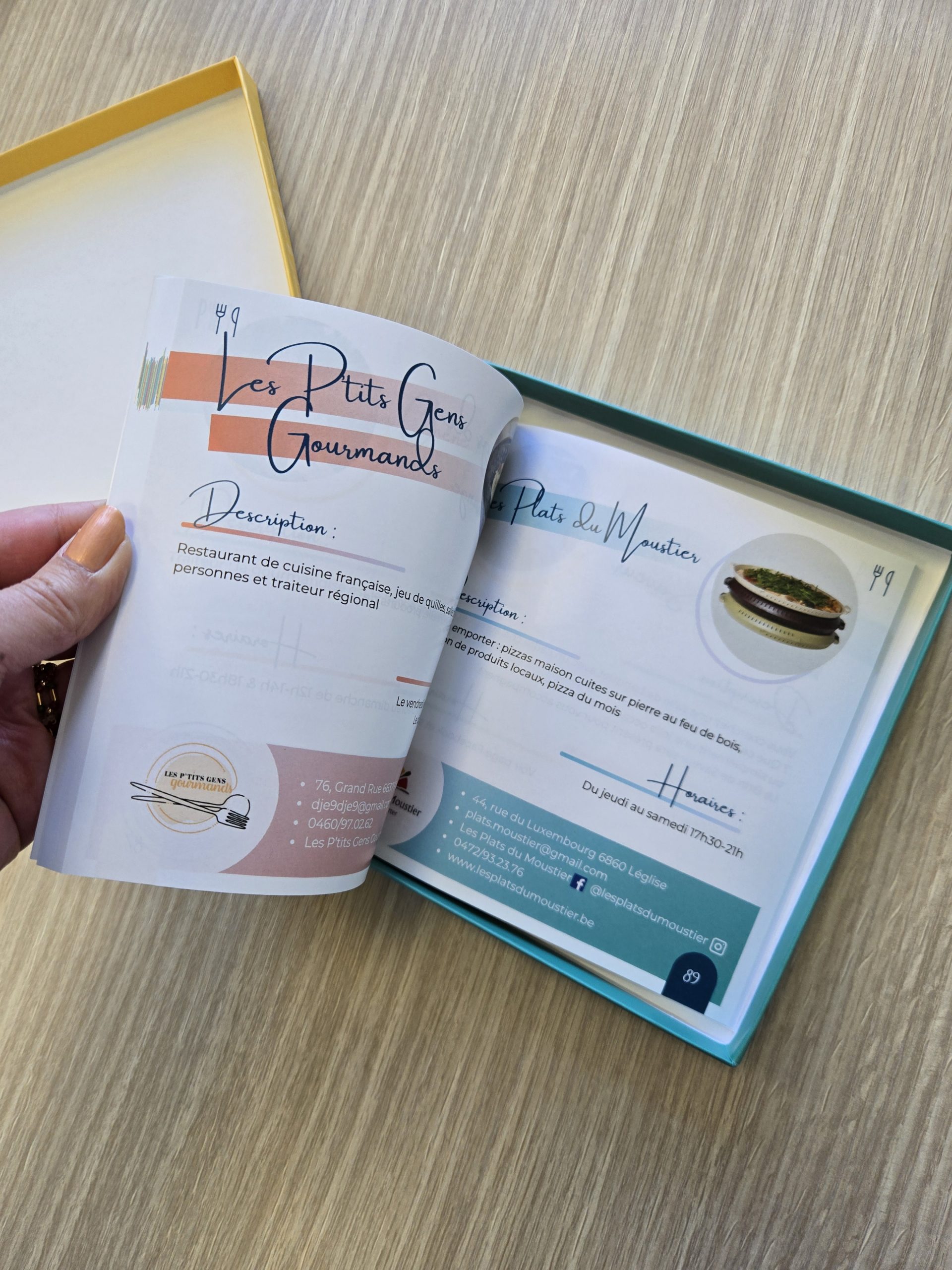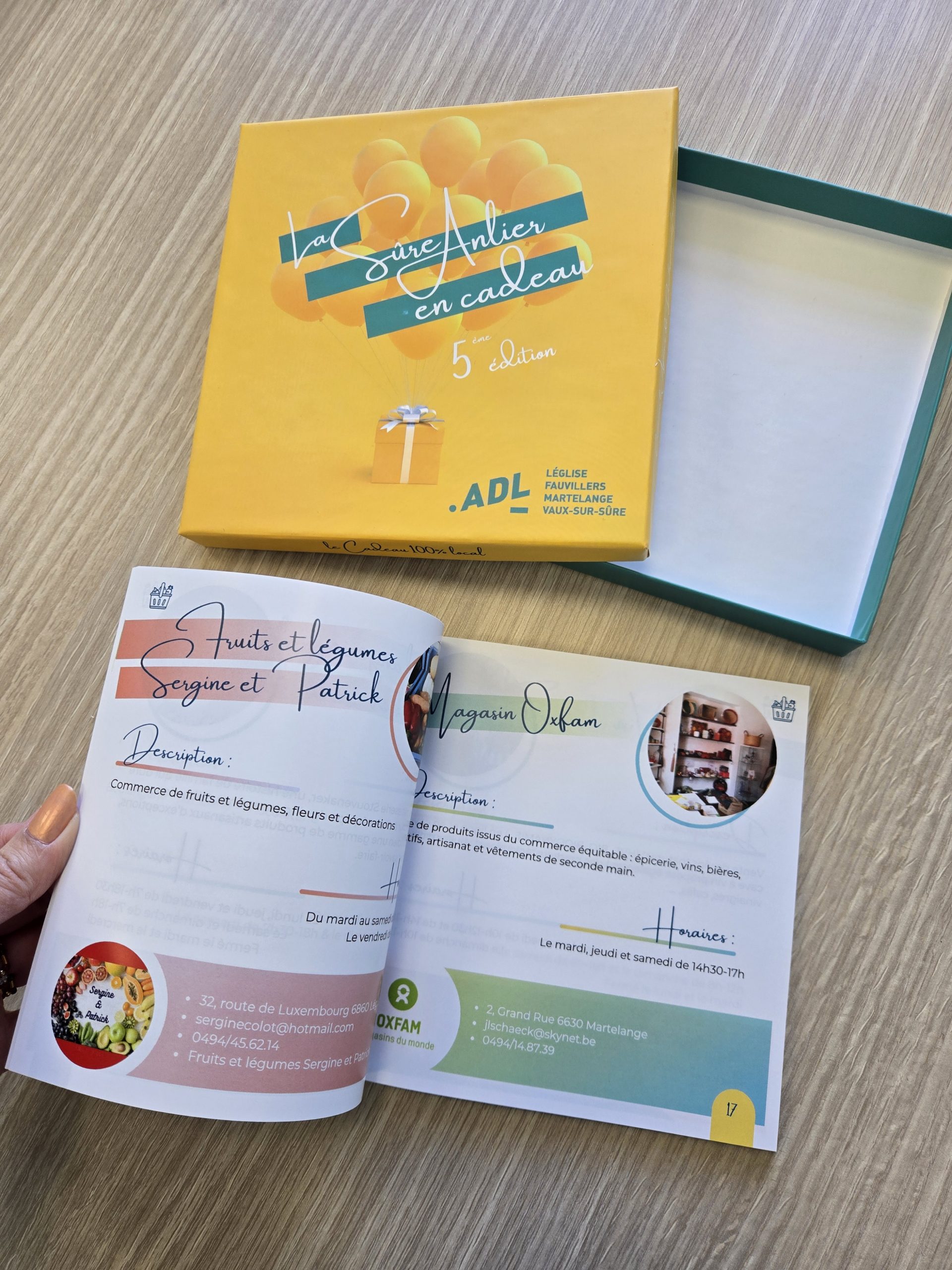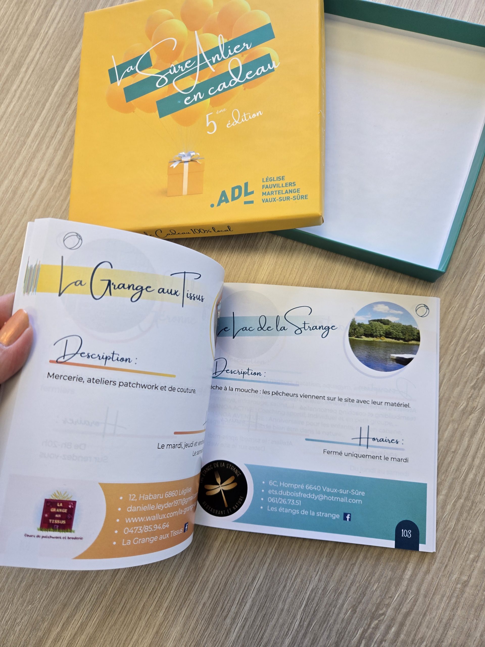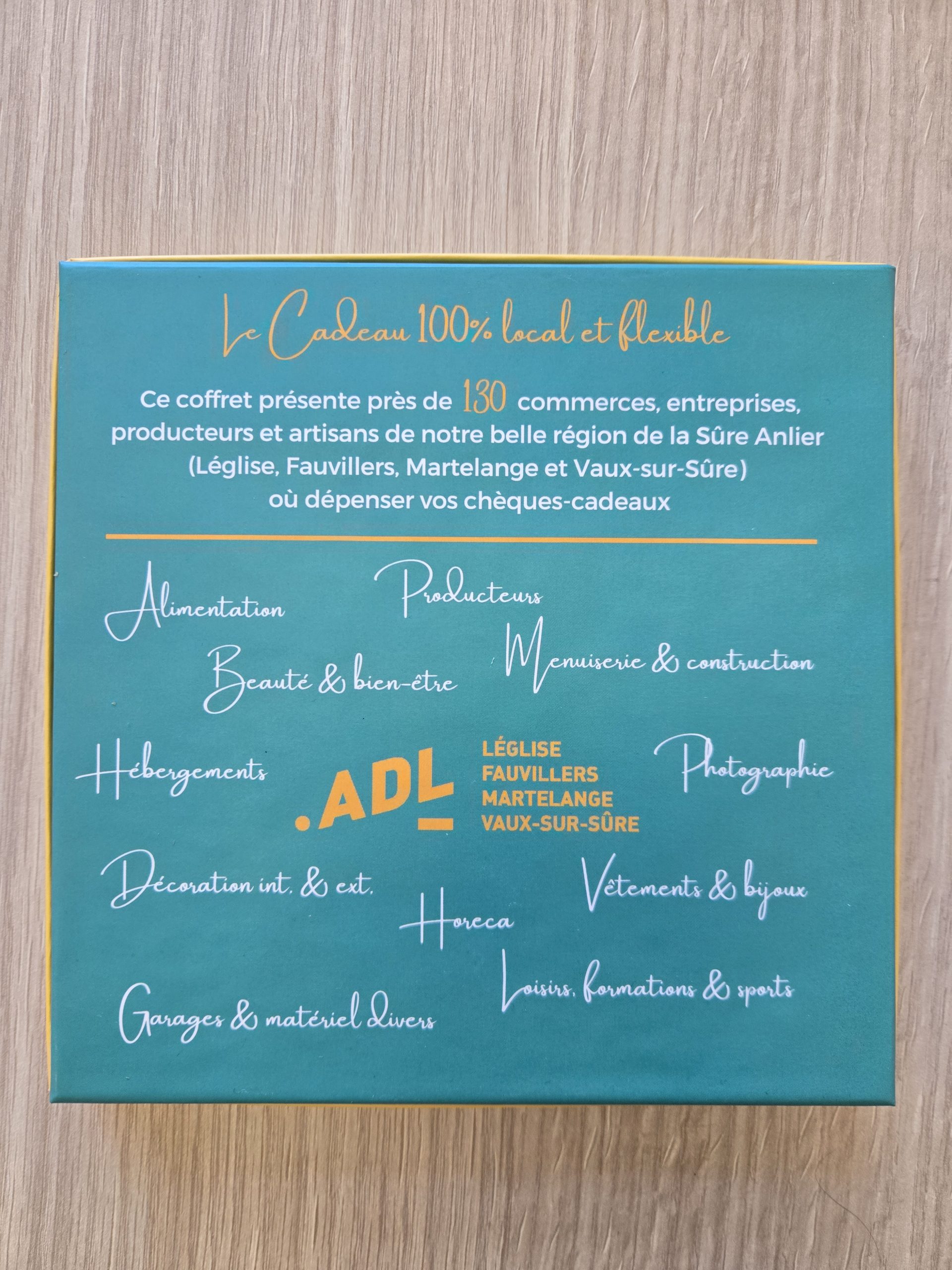Concept unique en Province du Luxembourg, ce coffret cadeau vous propose des produits, activités ou services 100% locaux sélectionnés au sein des communes de Léglise, Fauvillers, Martelange et Vaux-sur-Sûre. Vous avez le choix entre 127 indépendants locaux travaillant dans des secteurs divers et variés (gastronomie, beauté, automobile, menuiserie, soins, mode, etc).